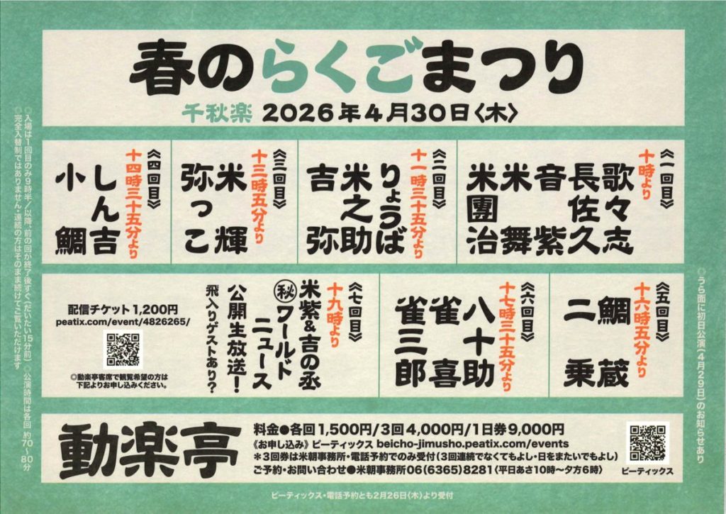 お問い合わせ:米朝事務所 06-6365-8281(平日10〜18時)